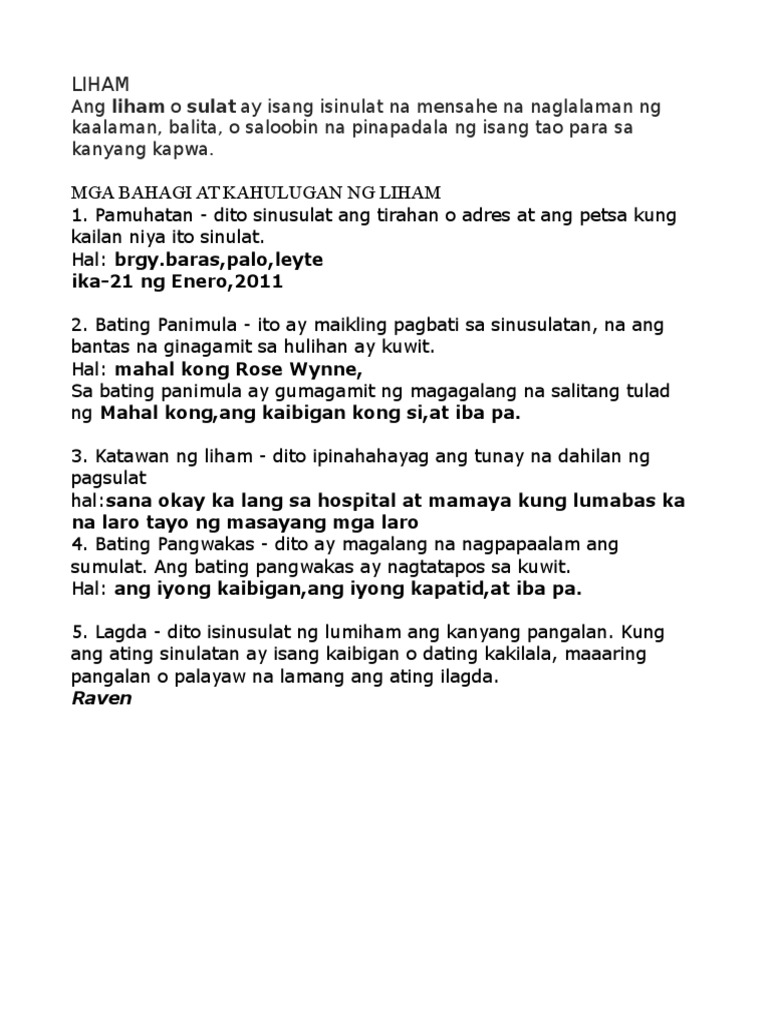 BAHAGI NG LIHAM Narito ang pagtalakay sa limang5 bahagi ng sulat at mga halimbawa. February 22 2012 in Feel Leap In Know. Liham para sa kaniyang guro at kaibigan liham na nagpapahiwatig ng pasasalamat at pamamaalam dahil ang tanging naiisip nalang ni Nathaniel na paraan upang maka alis sa sitwasyon nya ay tapusin na ang kaniyang buhay at agad nya itong ginawa pagdating ng mga magulang ni Nathaniel sa kanilang bahay pagkatapos.