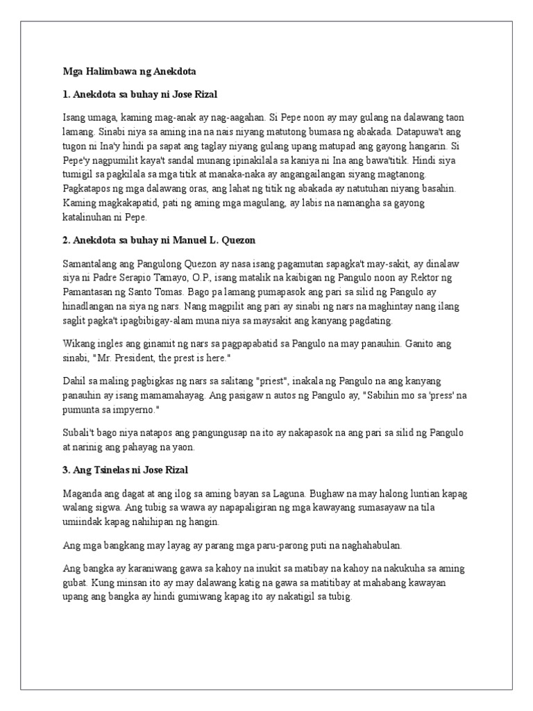 ANO NGA BA ANG ANEKDOTA Ang mga anekdota ay mga pangyayaring makatotohanan. Pero bago nating tatalakayin ang mga halimbawa ng anekdota atin munang pag. Heto Ang Mga Halimbawa Ng Anekdota Tungkol Sa Sariling Karanasan.